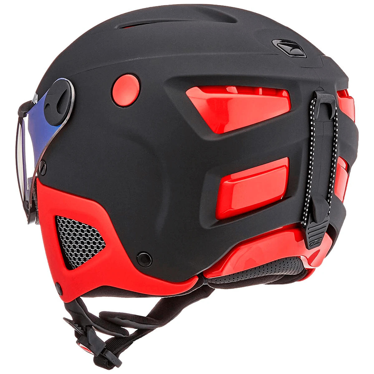 The helmet’s shell can be adjusted perfectly to the head by means of a fine ratchet system. This significantly increases comfort when wearing and a sense of security. A helmet that wiggles or presses down can ruin someone’s ski day. With the patented Ergo3 system, this doesn’t happen. The adjusting mechanism that lets the helmet adapt perfectly to any head shape can easily be used even when wearing thick gloves. The high-quality interior fittings of the hardshell helmet also allow maximum comfort and a secure, draught-free feeling. The helmet’s front edge is protected by wear-resistant material that keeps the soft inner lining warm even at cold temperatures. One-Touch ventilation ensures air supply: A handle can be used to open or close the ventilation slider. The air flow can thus be regulated and adapted to the weather conditions. This ensures that the climate inside the helmet is always pleasant. With the Attelas visor, the Varioflex mirror visor eliminates reflections, distracting glares and infrared rays. Contours are highlighted in contrast, and the tinting automatically adjusts to lighting conditions. Other visor options are also available separately as accessories. Thanks to the unrestricted 180° view and the large interior volume behind the visor, the helmet is also especially well suited for glasses wearers.