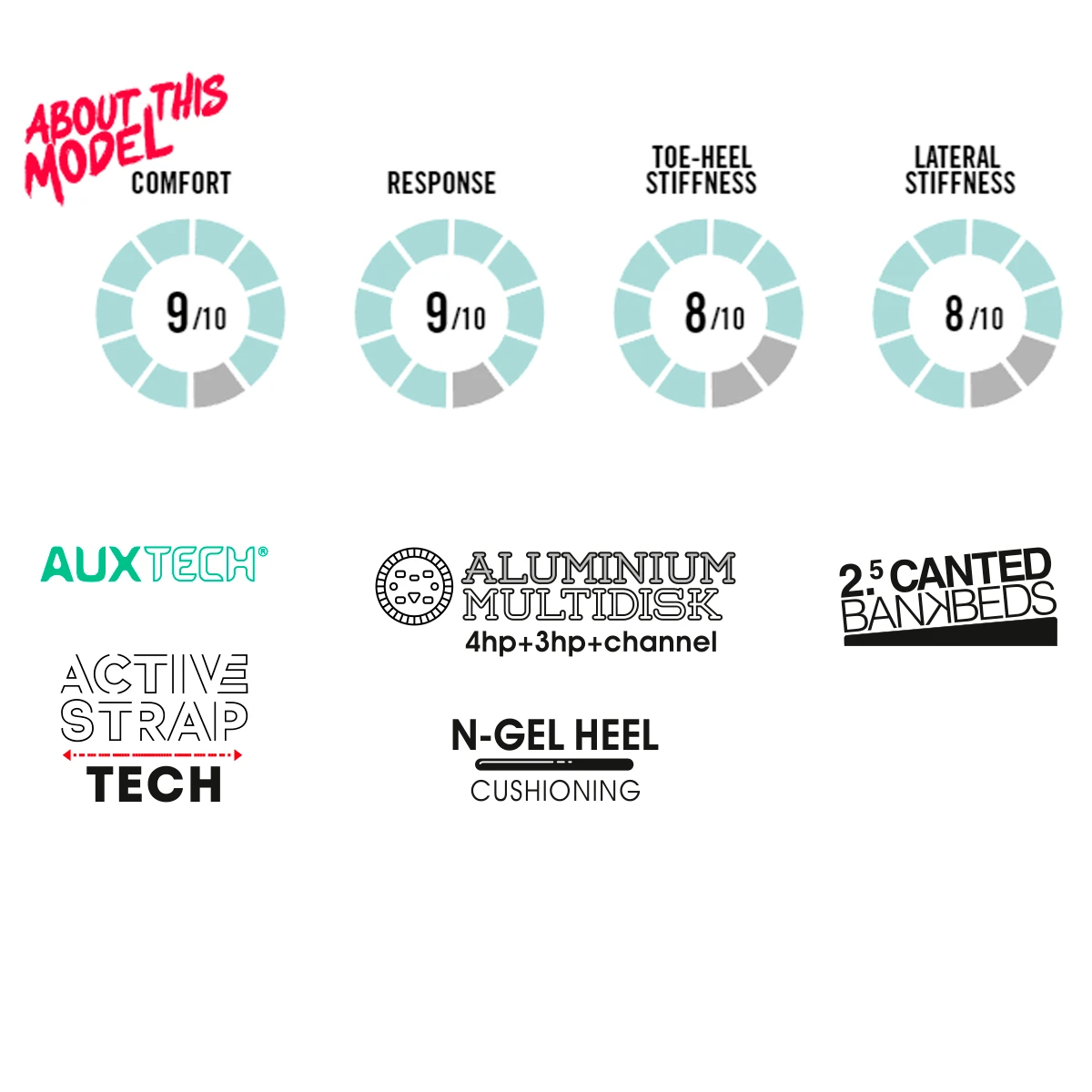 Built on the same bombproof aluminium chassis as the flagship NX2-CX, it comes with a slightly less aggressive glass-filled nylon ModBack that can be customized for a perfect fit. It also offers a little more freestyle tweakability for shredders looking to hit the park. The NX2’s ExoKush Fusion straps provide awesome locked-down foot-hold that you can set once and forget. They are made from expanded EVA to prioritise comfort and durability. Thanks to ActiveStrap Tech they also lift automatically when you recline the hiback and tighten back down when you close it – accelerating our lightning fast entry-system even further. N-Gel heel cushioning and full length Bankbeds absorb excess chatter and heavy landings, while the 2.5 degrees of canting works with your natural riding stance to improve energy transfer. Along with the fresh new colorways, no corners have been cut to ensure the latest NX2 is ready for all-mountain destruction.